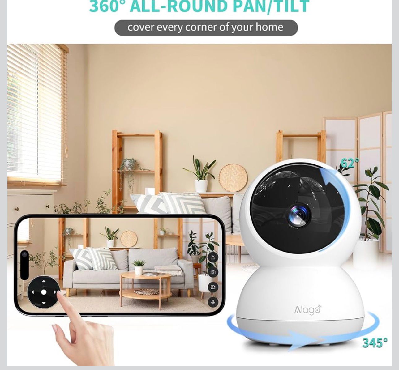 - Cobertura de 360° y alertas en tiempo real: Cámara de seguridad para el hogar. Monitorea cada rincón sin esfuerzo. La cámara gira 345° horizontalmente e inclina 62° verticalmente, controlada a través de la aplicación. Comuníquese directamente a través del audio bidireccional integrado siempre que se detecte movimiento o desee hablar. Elige entre sonidos de alarma, sirena o advertencia para disuadir a posibles intrusos al instante